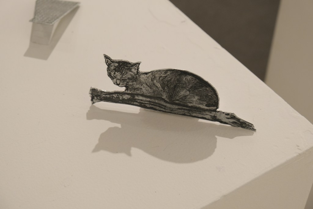 Terrains in Transition navigates physical and affective landscapes constantly in motion—built, worn away, lived, and remembered. Throughout the exhibition, terrain is a place where function and feeling converge, where areas change under the force of time, usage, and imperceptible drift. The works consider how shapes—whether built, domestic, or symbolic—evolve in significance and substance over time. Staged assemblages composed of mundane packaging, domestic detritus, and manufactured objects resonate with the developments of the city and standardization, and call attention to how we remake our worlds to reflect regimes of control, containment, or comfort. Fragile etchings of weathered facades and neglected corners provide a counterpoint—subtle observations of time’s inscriptions, asking viewers to attend to the poetic details that are lost in the rush of everyday life.