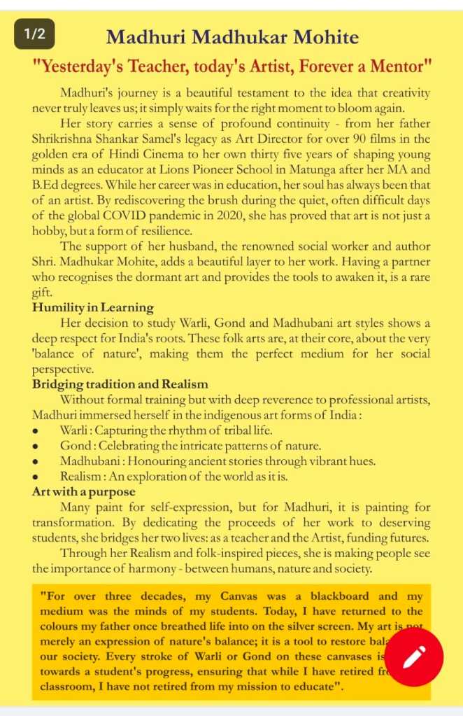 Many paint for self-expression, but for Madhuri, it is painting for transformation. By dedicating the proceeds of her work to deserving students, she bridges her two lives: as a teacher and the Artist, funding futures.